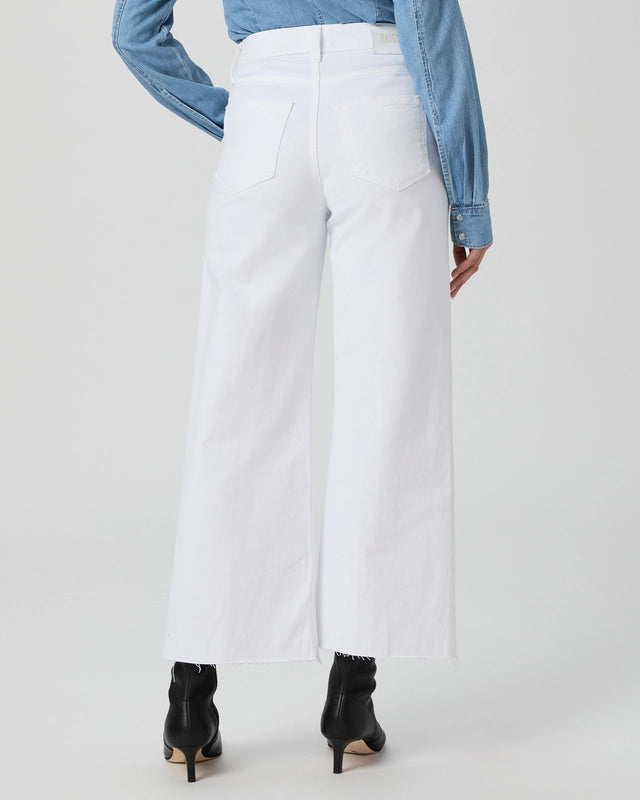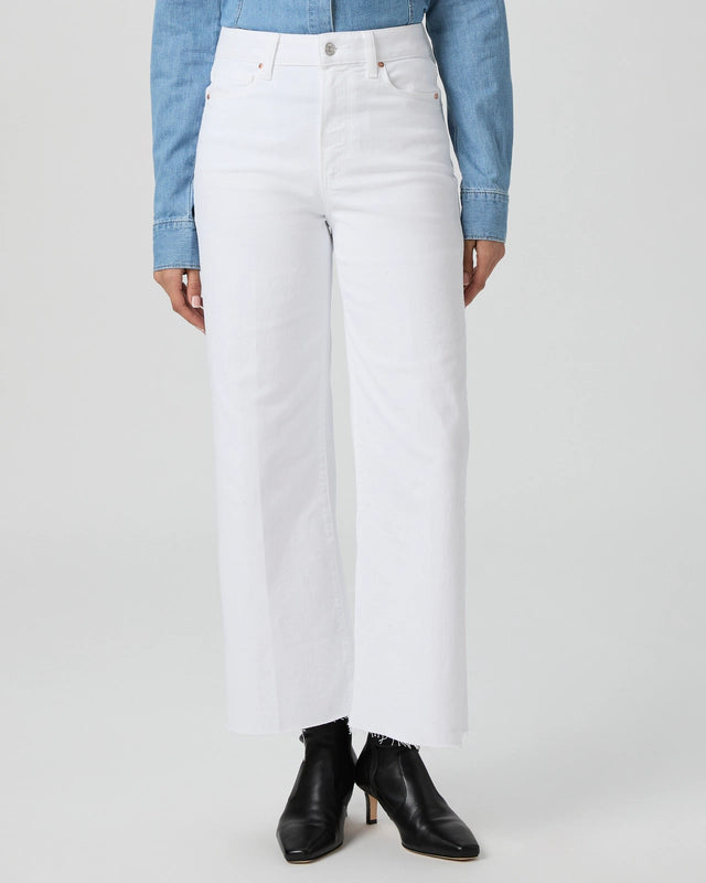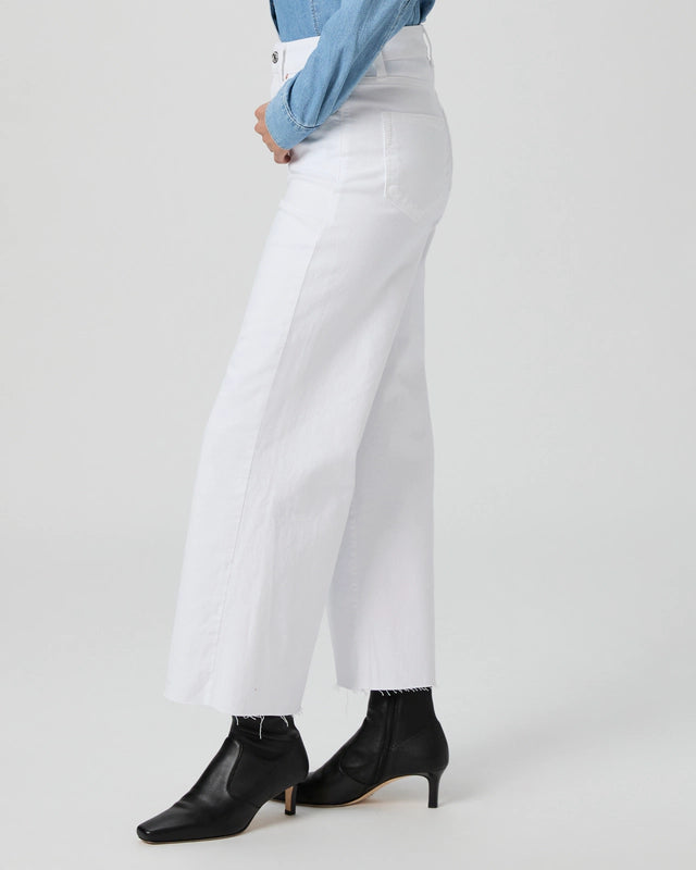 Anessa is PAIGE's modern high-waisted wide leg with a slightly relaxed fit and an ankle-length silhouette for an effortlessly chic look. This pair comes in crisp white with a raw hem and is crafted from comfort stretch denim with plenty of coverage and the perfect amount of stretch.