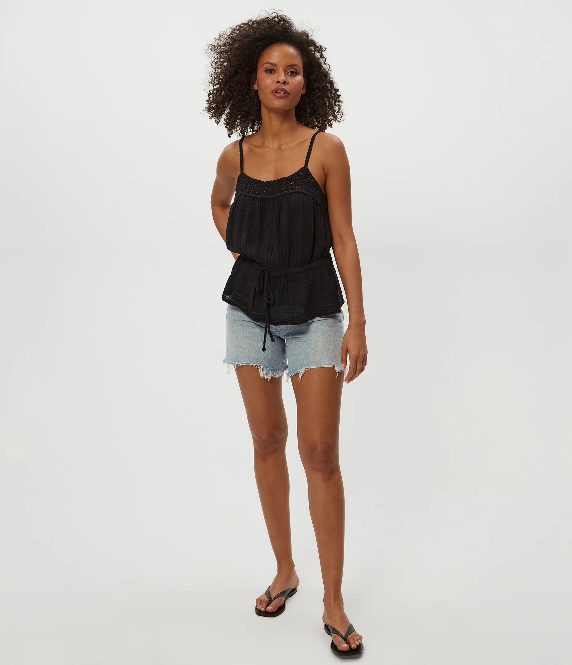 A key warm weather piece, the Dahlia Tank has a square neckline, tie waist detail and spaghetti straps. Withstand out crochet trim and a fluttering hem, this feminine style lightens up any look.