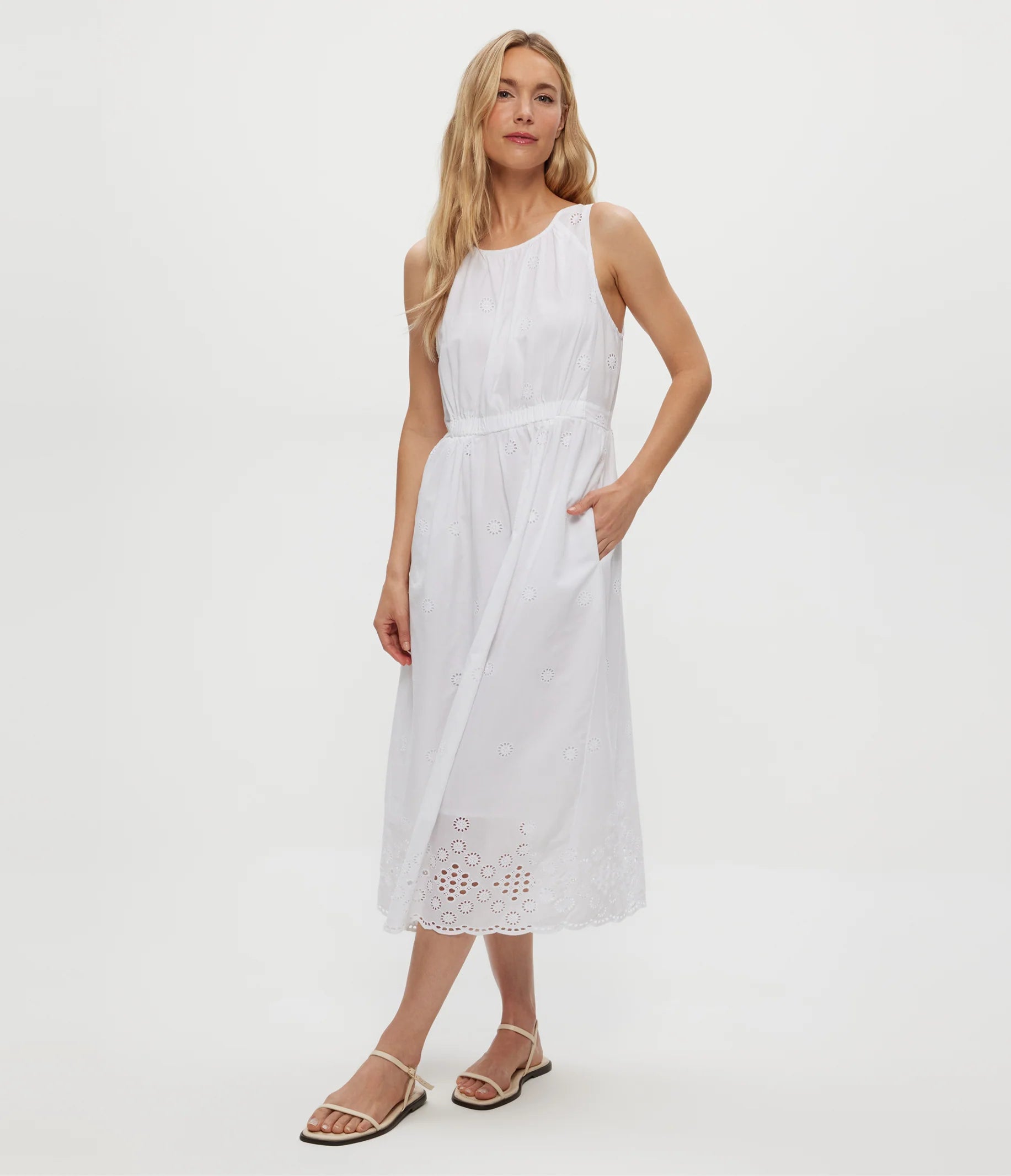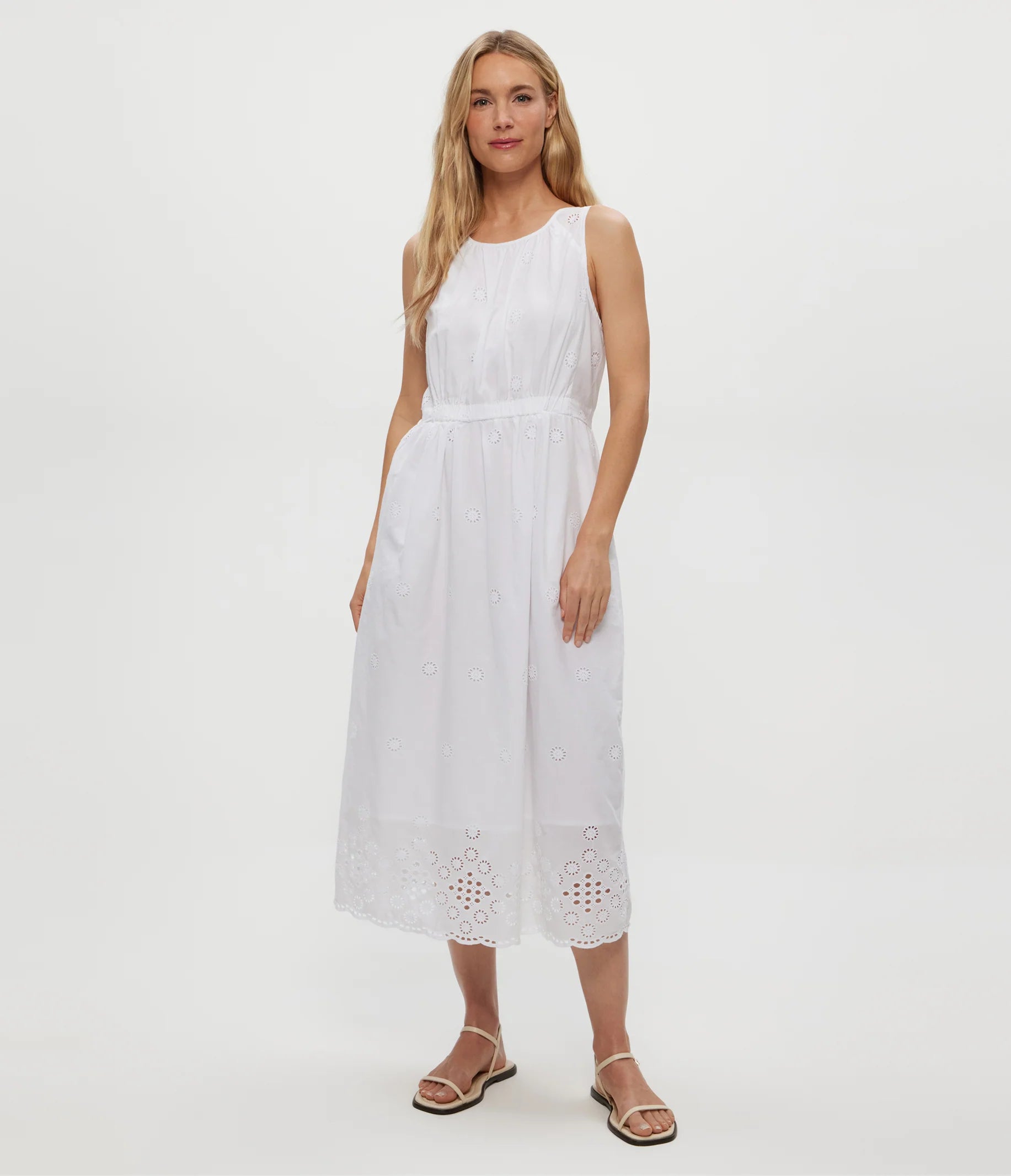 A chic and memorable dress, the Faith Eyelet Midi Dress has a round neckline and an elasticized empire waist. With all over delicate eyelet detail and a scalloped hem, this dress is ideal for warm weather days.