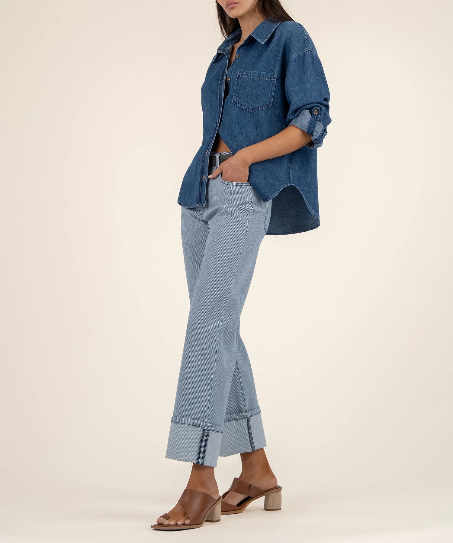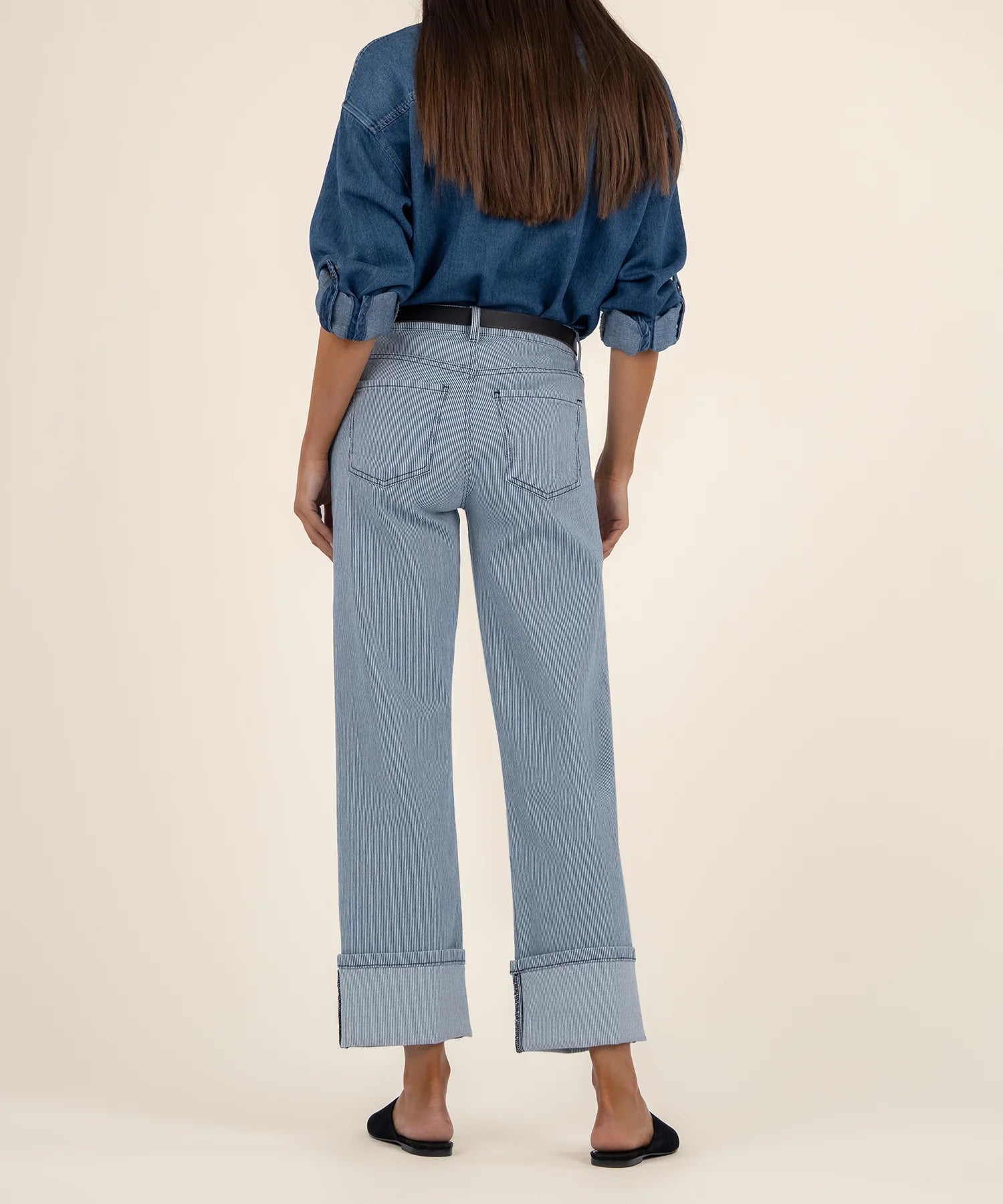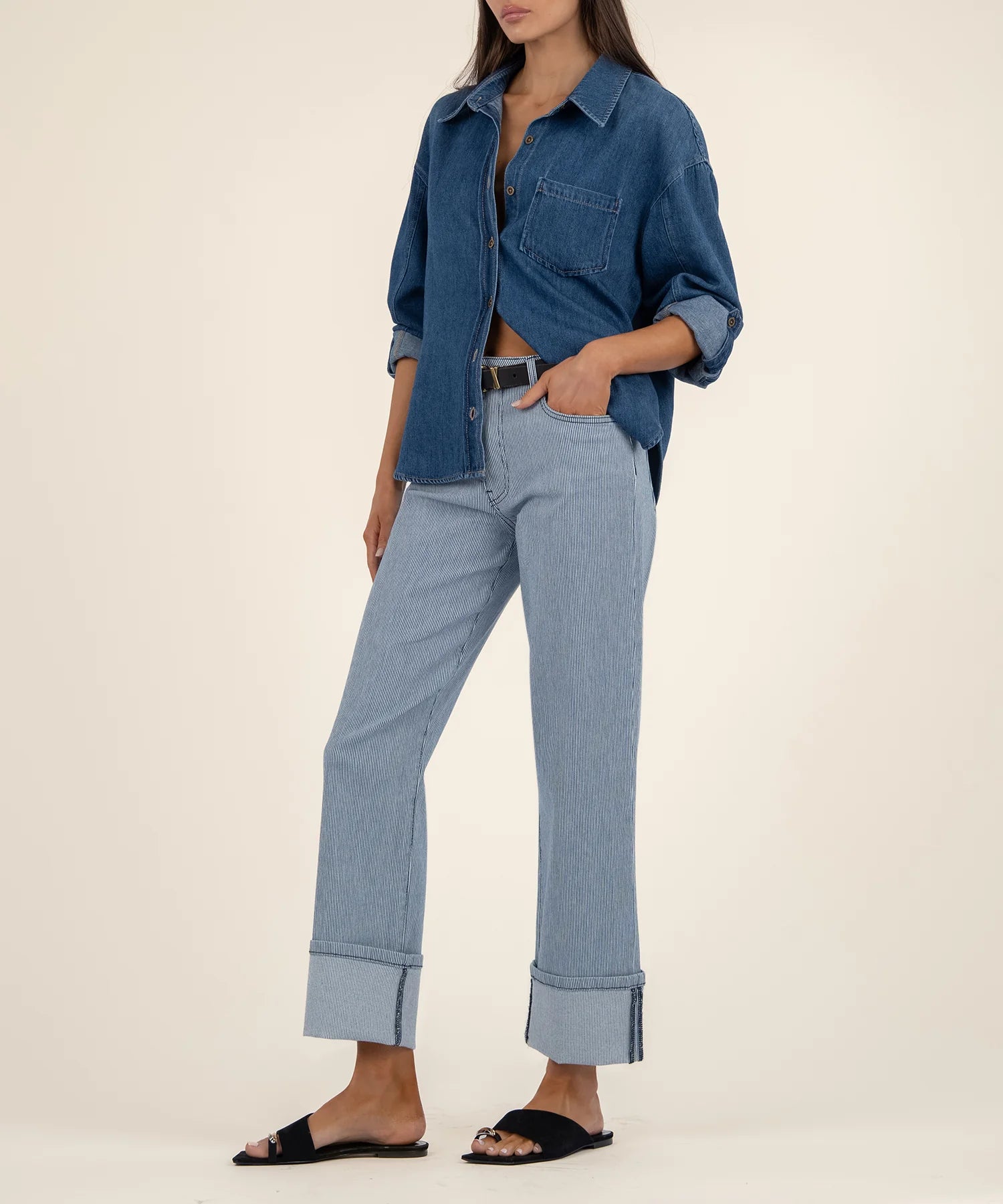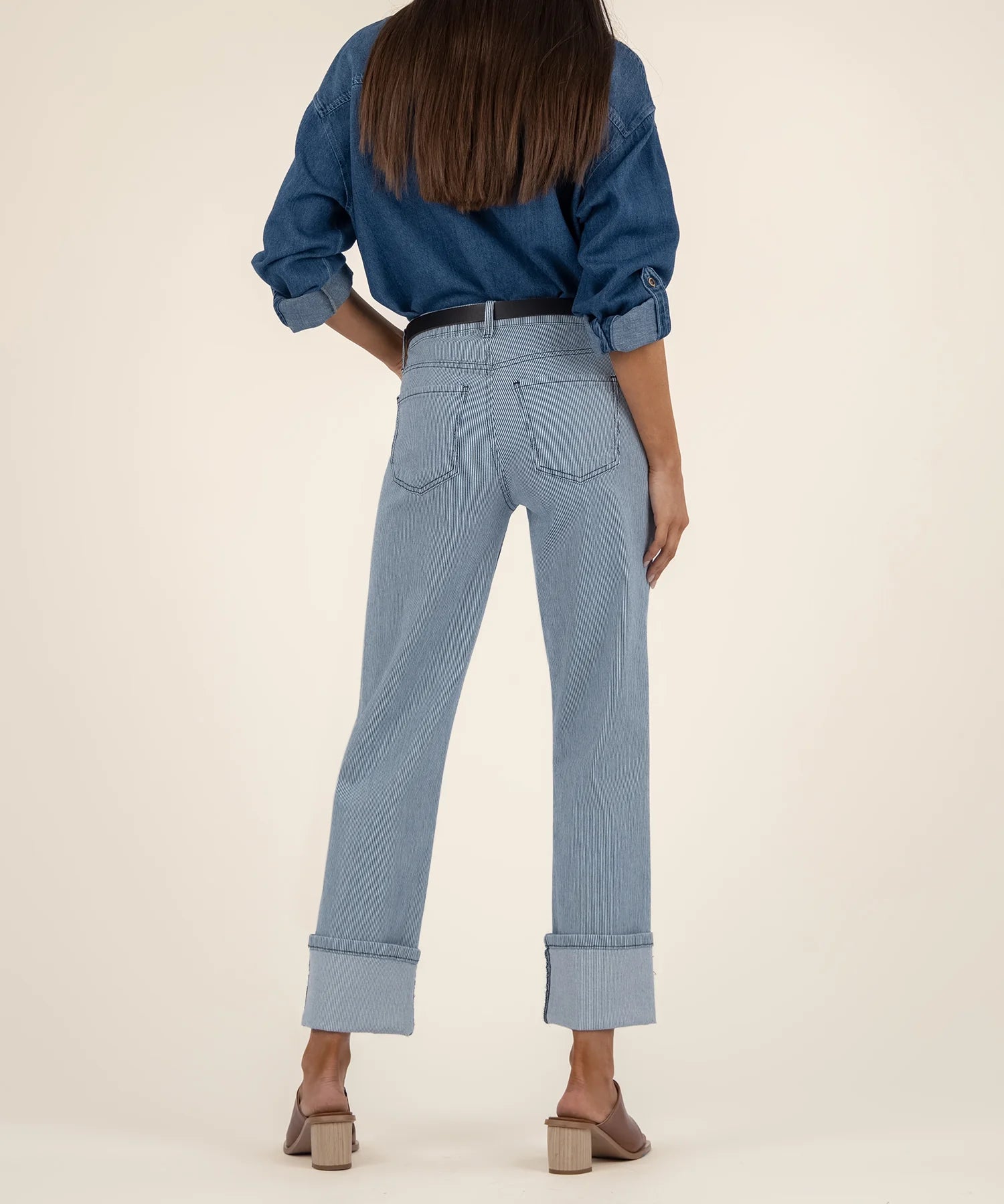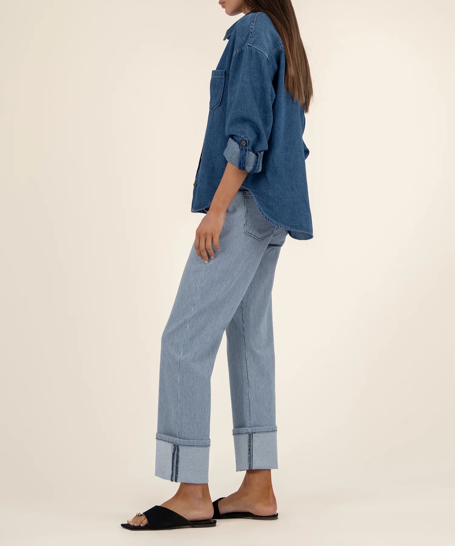 These high-rise Fab Ab straight leg jeans with a roll-up detail and blue-white lawn striping offer a flattering fit and playful style.