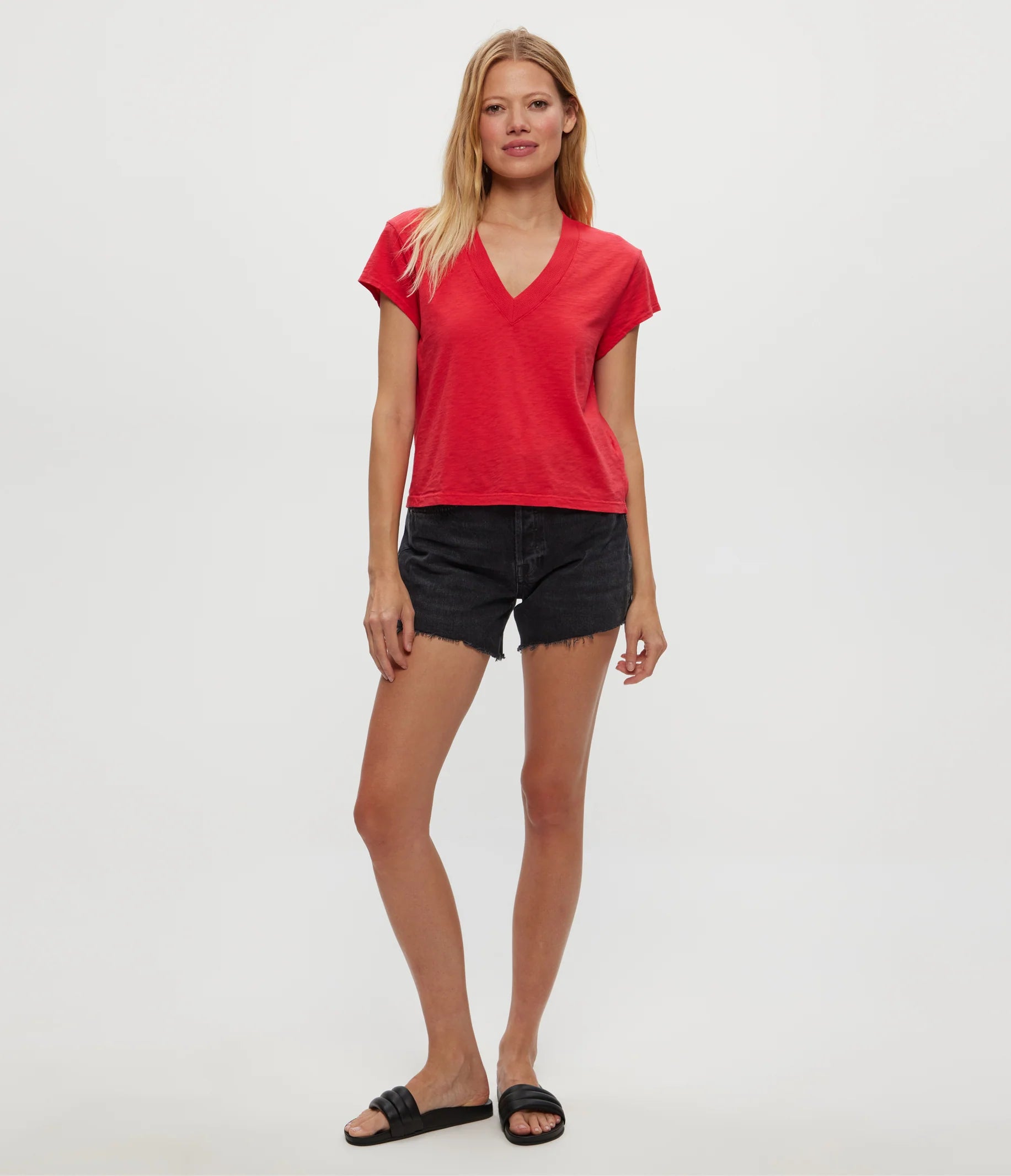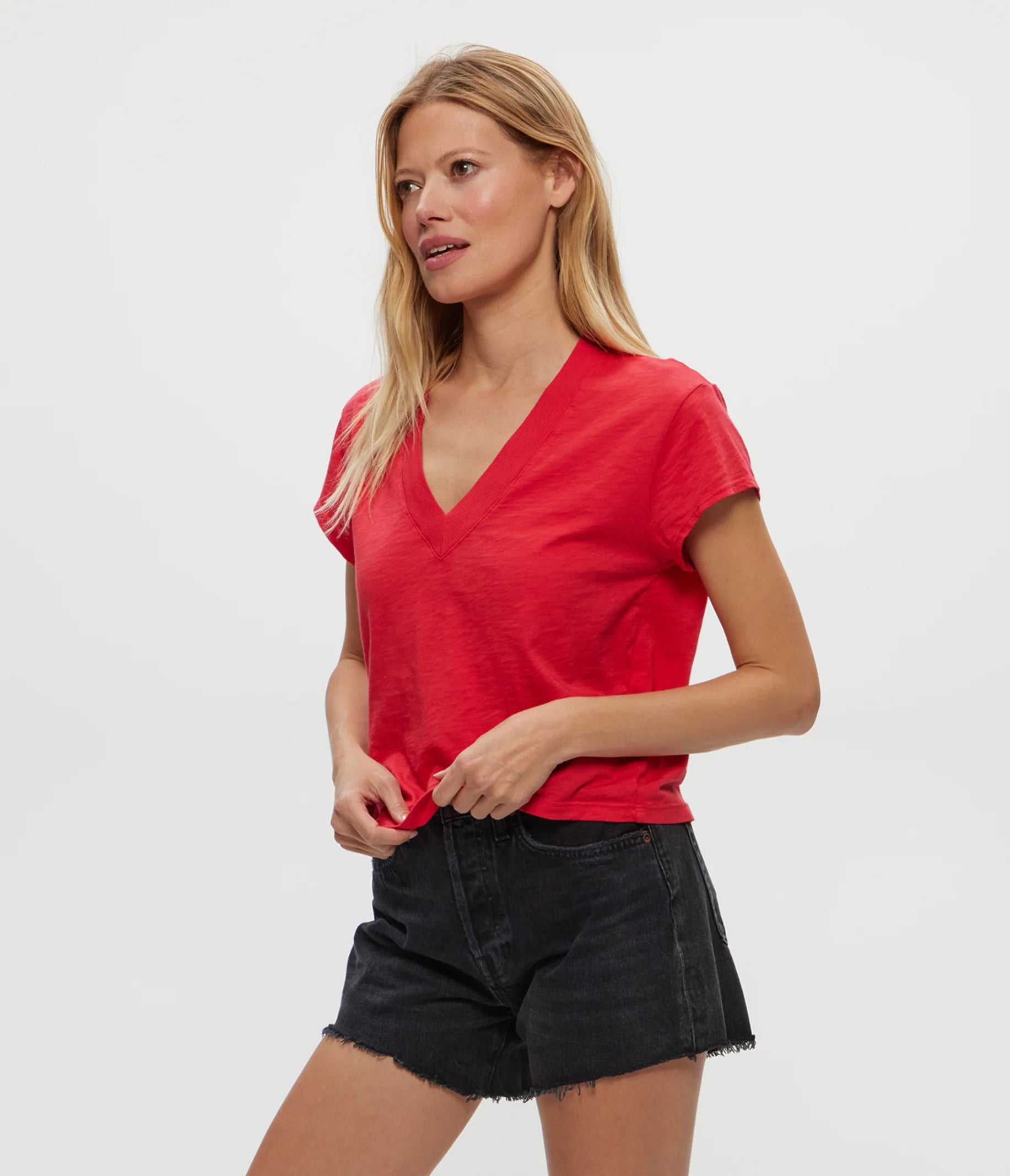 Your day-to-day tee, got a refresh in our beloved SUPIMA® cotton. Offering a more generous fit, this basic has a big personality with a v-neckline complete with a wide-ribbed trim, short sleeves, and a cropped fit that stops just at the top of the waistband. This, wear-with-everything tee, exceeds expectations as a comfortable, but stylish option for every body.