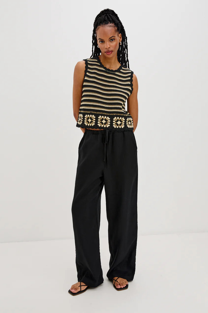The Hazel is a cotton crochet tank with a cropped fit. Scallop detailing follows the neckline and arms, and a hand-crocheted panel lines the hem.