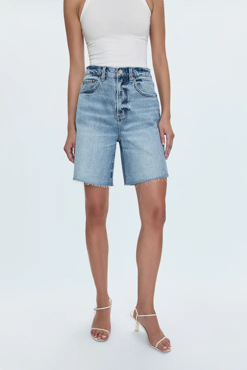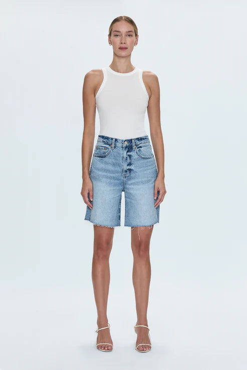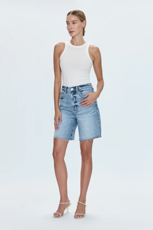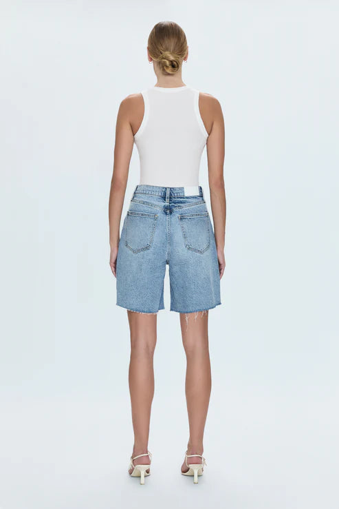 Now hitting cruising altitude. High rise, pinched waist short that falls into a long length, loose fit leg. Crafted from our signature comfort stretch denim for everyday wearability. Boulder is a light blue denim wash with vintage-inspired fading, light whiskering, and a frayed hem.