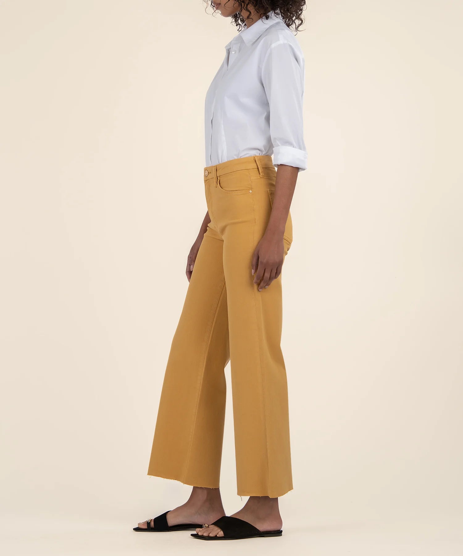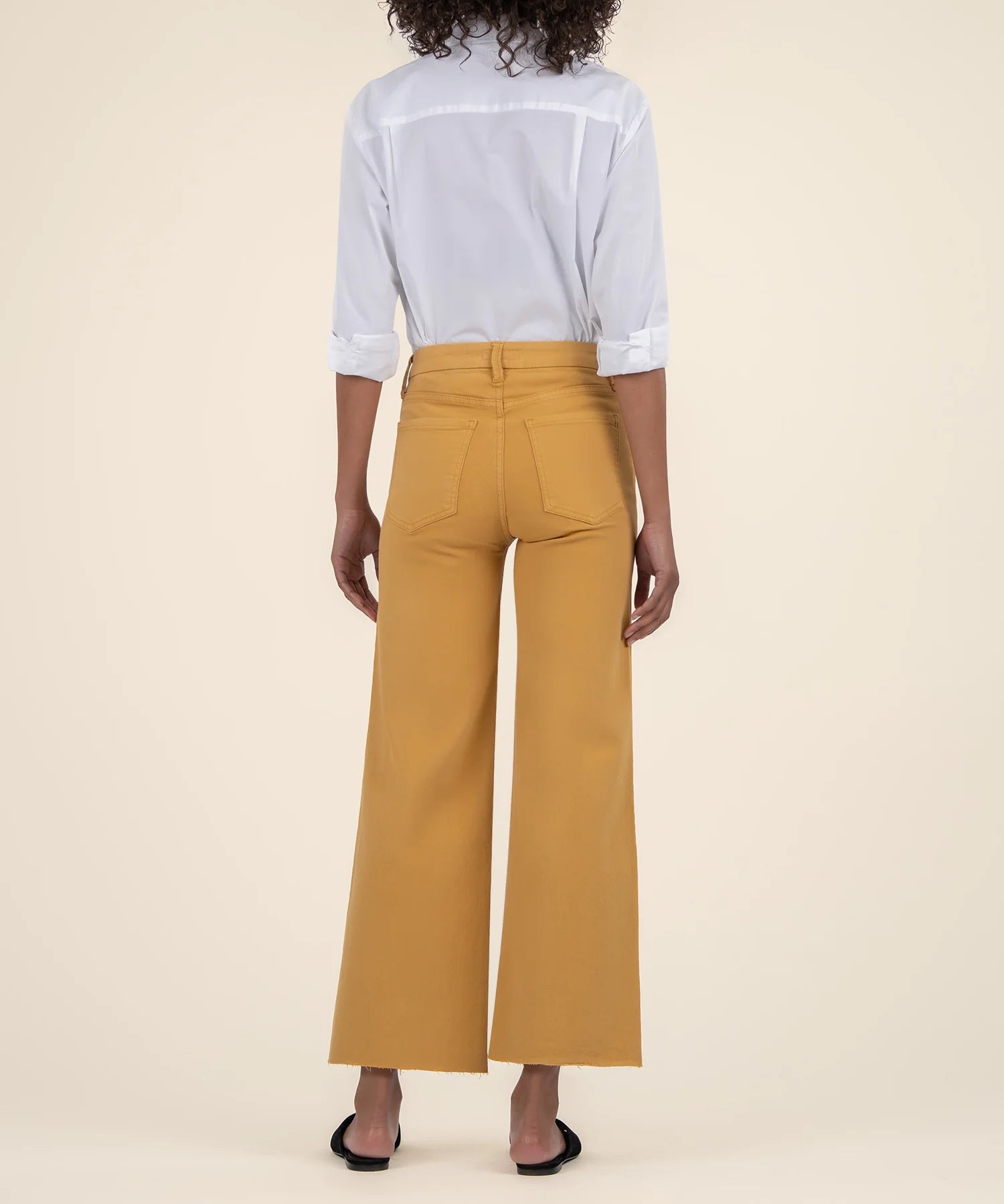 A vibrant hue refreshes the style of these subtly faded, raw-hem wide-leg jeans fitted with Fab Ab front pockets that comfortably shape and smooth.