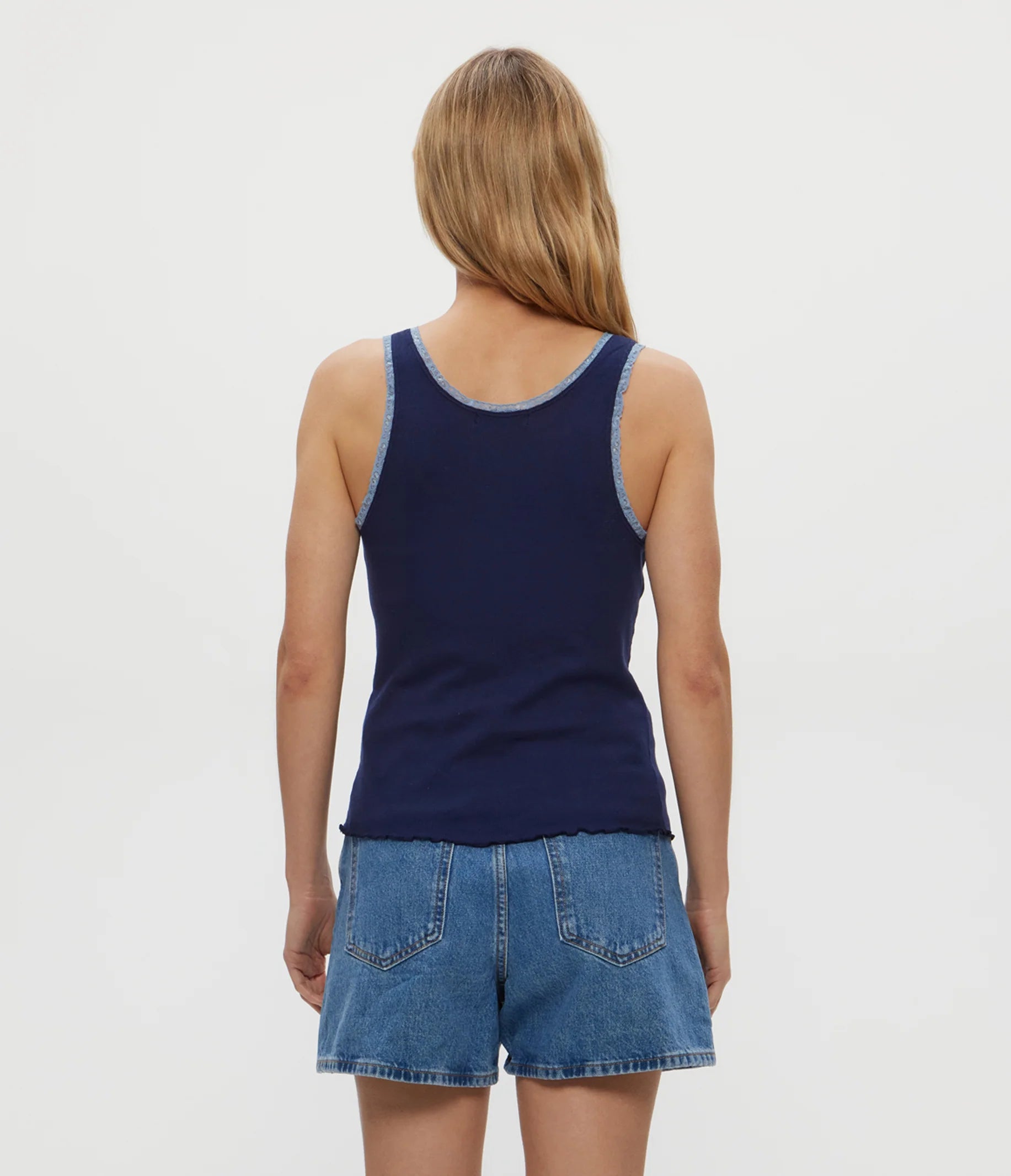 A delicate lace trim provides a touch of softness to everyone’s favorite Supima Rib tank. With a classic scoop neckline and lettuce hem, what feels like a basic becomes a must in your rotation thanks to its feminine detail.