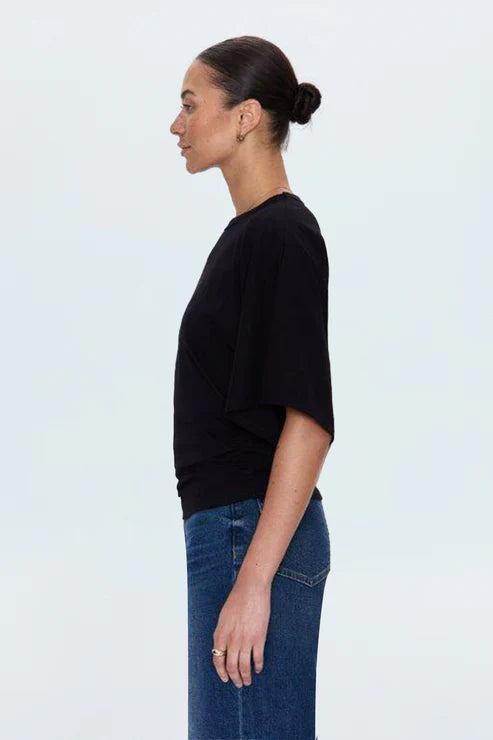 The perfect tee for the season. Veronica delivers a relaxed dolman shape with drop shoulders that transitions to a fitted silhouette through side cinching. The bodycon effect feels intentional, while the shirttail hem adds subtle movement. Crafted from a 100% cotton compact jersey that holds its shape and feels luxuriously soft against the skin. Noir brings timeless black sophistication that elevates any look, great for layering or standing alone.